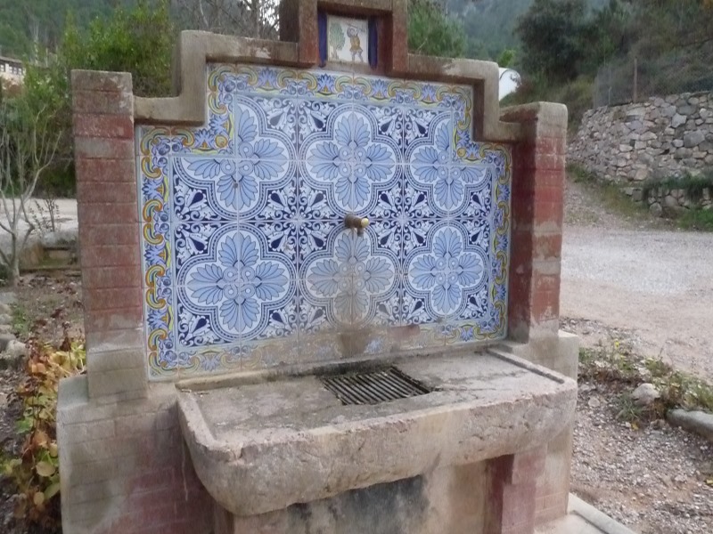 Font d’aixeta amb una pica situada a l’edifici de la mina i envoltada per un mur de pedra seca. Aquí abandonem uns minuts els senyals blancs i vermells del GR per seguir uns de verds que surten de l’esplanada de la font i que pugen al castell en pocs minuts. Primer pugem per un sender emboscat i a través d’unes escales a la part final de pujada.