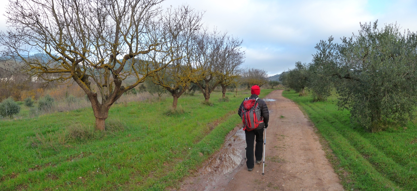 A l’altra riba del Francolí ens afegim al GR-7 que ve de La Riba, punt on trobem un pal indicador de GR. Girem a l’esquerra seguint en direcció a Lilla, població a 5,415m segons ens marca el senyal. El camí va entre camps d’oliveres i ametllers amb la Serra de les Guixeres a la nostra esquena.