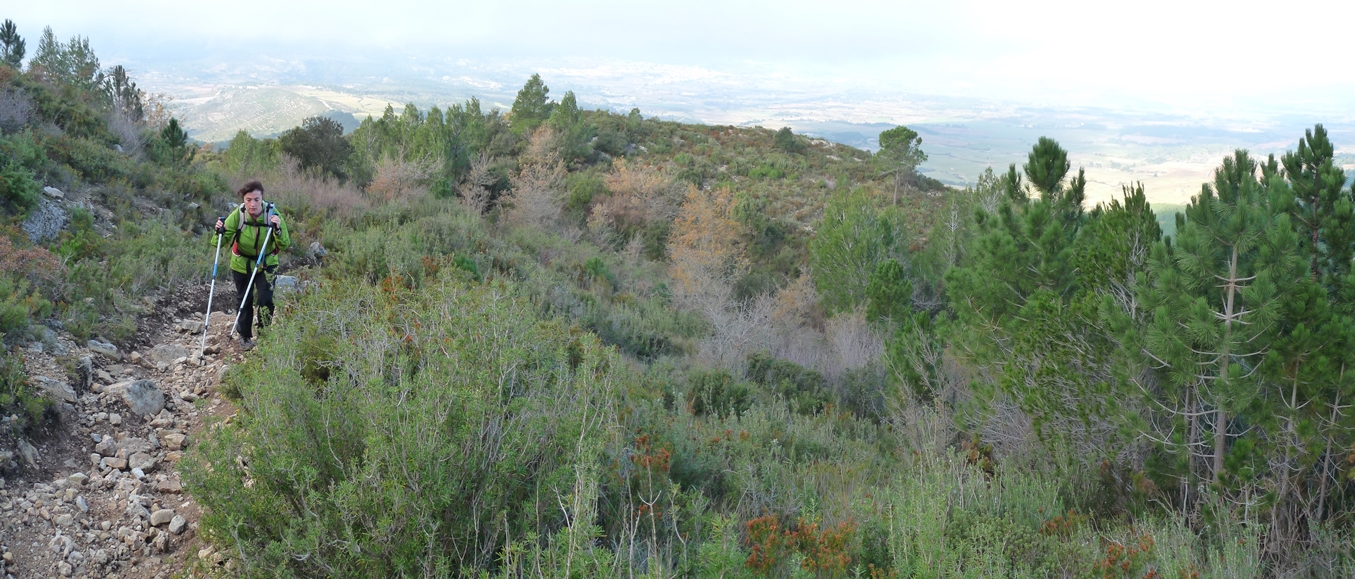 Agafem el camí de la dreta en direcció a Miramar (a 1,735km segons l’indicador) per un corriol que puja per un tram entre alzines, garric i romaní. Més endavant el sender s’afegeix a una pista que ens porta a una collada enmig d’una pineda amb xipresos amb un cadenat.