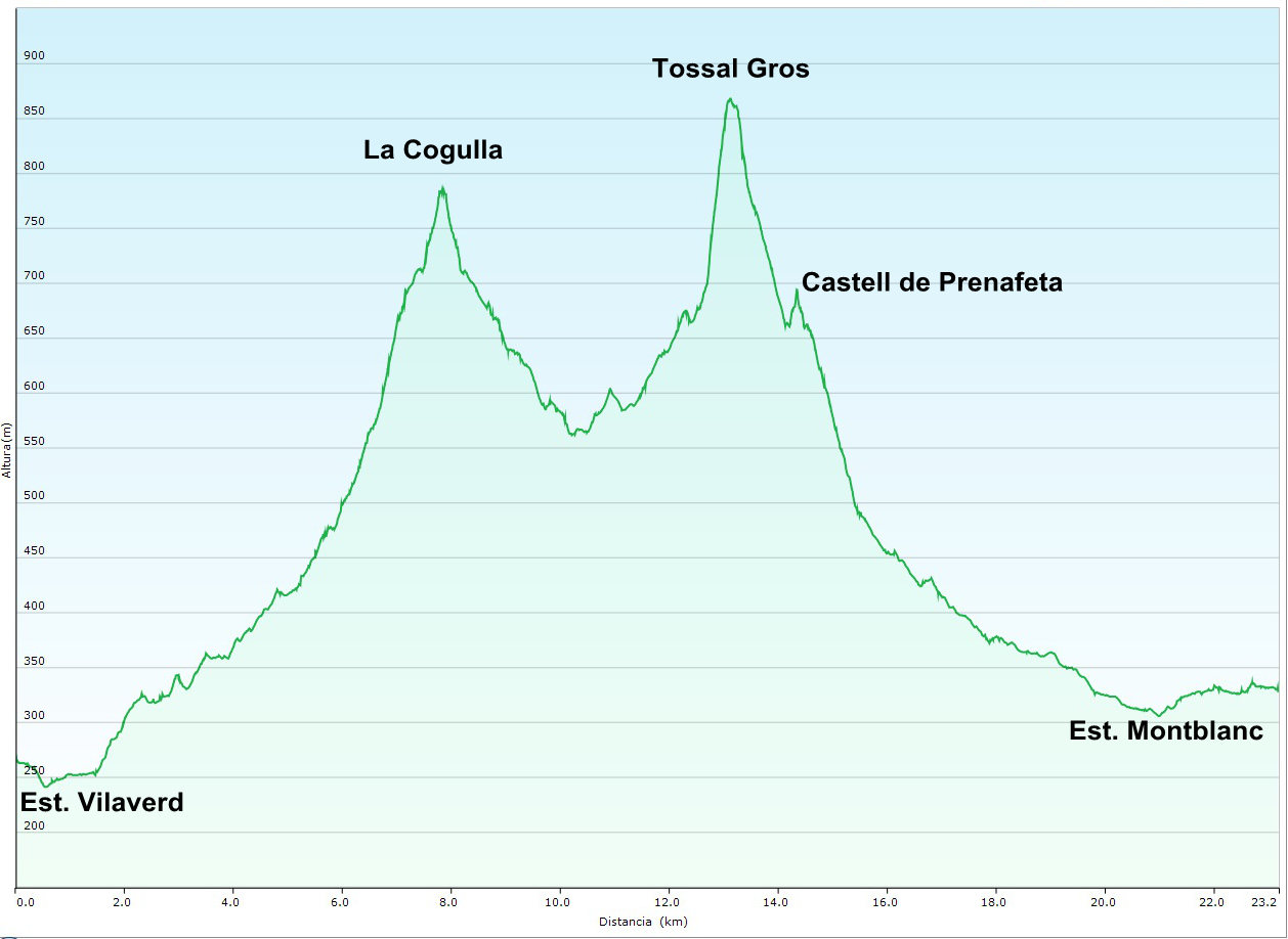 - Ruta: Estació de Vilaverd – pont d’Argüelles – Lilla – La Cogulla – Miramar – Alzina Grossa – coll de Prenafeta – Tossal Gros – coll de Planota de Faló – Castell de Prenafeta – Prenafeta – Santa Anna de Montornès – Montblanc