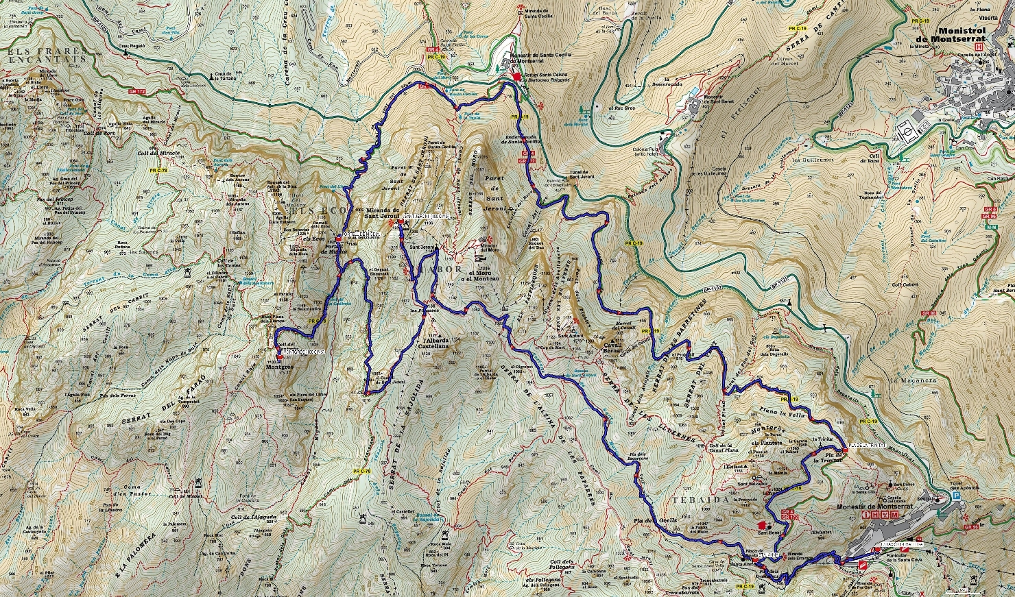 - Ruta: Estació de Montserrat – Escales dels Pobres – Pas dels Francesos – Plaça de Santa Anna – Pla dels Ocells – Pla dels Escurçons – Ermita de Sant Jeroni – Sant Jeroni – les Pinasses – Coll del Montgrós – Montgrós – Portell de Migdia – Santa Cecília (a pocs metres) – Pla de la Trinitat – La Trinitat – Sant Benet – Plaça de Santa Anna – Montserrat.