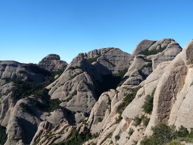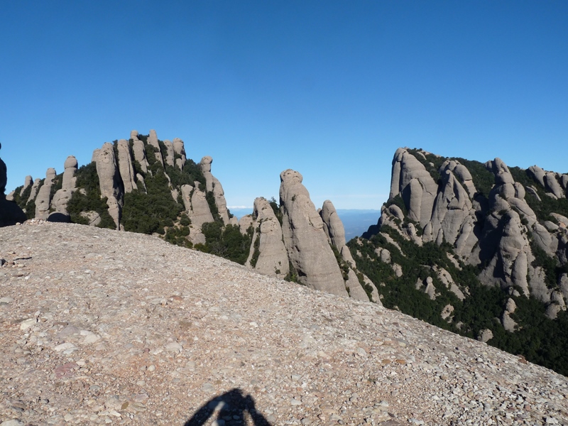 Tornem de nou a la cruïlla de camins (pal indicador), amb vistes sobre la vall de Santa Maria cap a ponent. Cal estar atents atès que en aquest punt abandonarem el PR C-19 que veníem seguint des de la sortida de Monistrol. Deixem el sender de petit recorregut que va cap al Pla de les Taràntules per agafar el corriol a la dreta en direcció al Monestir de Montserrat seguint el GR-4 i el GR-172.