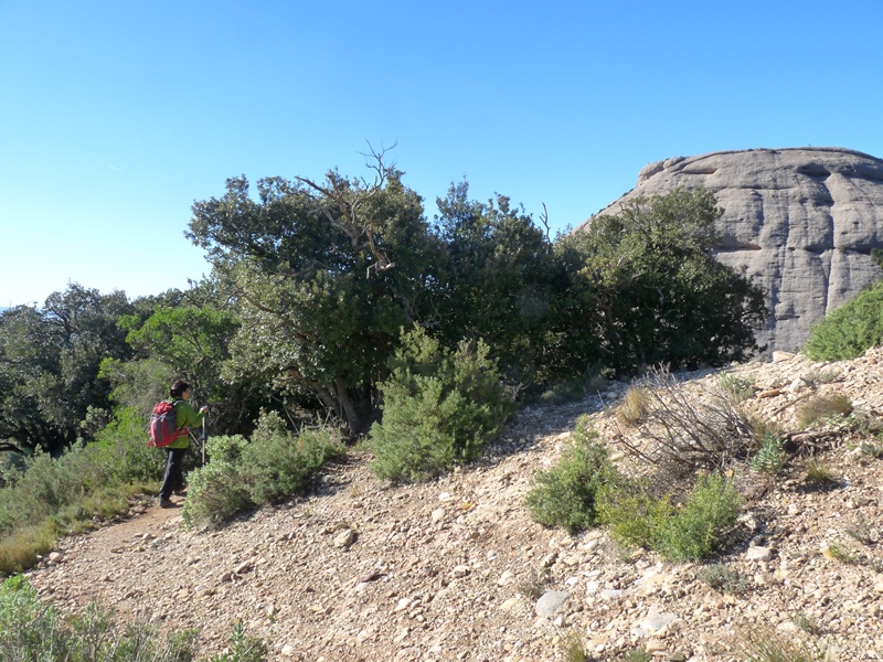 Som al tram més interessant de la caminada. El camí va entre un frondós alzinar amb boix, galzeran i roures que fa baixar uns graus la temperatura que teníem en altres zones de la pujada. El sender transcorre pel vessant nord del massís sota les imponents parets de Sant Jeroni i dels Diables. Mentre caminem podem alçar el cap i mirar de buscar els escaladors que pugen el Cavall Bernat per la via Punsola-Reniu (230m 6c) o per la Gran Il·lusió, 235m 7a+ (6a+ oblig.), dues vies clàssiques d’escalada d’aquesta imponent agulla montserratina.