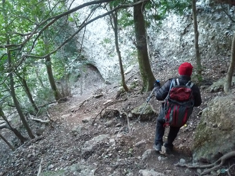 Seguim el PR C-78 en direcció a la Font de la Cadireta i el Montgròs entre un humit alzinar. El camí passa per una espectacular canal, estreta i incòmoda però sense dificultats. El camí gira després cap a ponent per anar a buscar el coll de Montgròs per un tram de sender on hi ha algun teix.