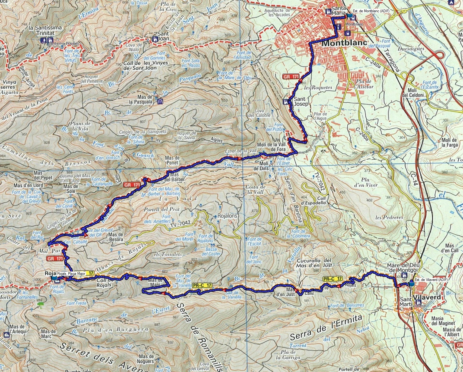 - Ruta: Estació de Vilaverd – Santuari de la Mare de Déu de Montgoi – Mas d’en Just – Salt de la Variella – Mas de Magí – coll de Rojals – Rojals – font de Burxoc – font del Grèvol o del GR – Estret de la Vall – Molí de Dins – Molí de la Vall de Fora – Sant Josep – Montblanc