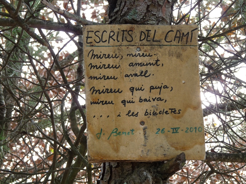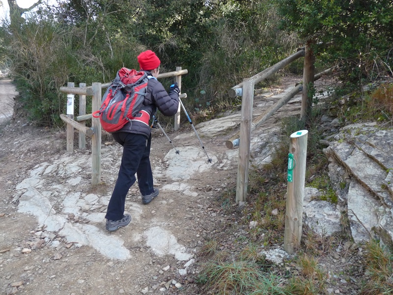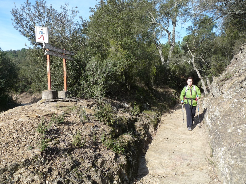 A partir d’aquest punt el sender va seguint paral·lel a la carretera, creuant-la en diferents punts i havent de caminar sobre l’asfalt durant algun curt tram. Per sort la senyalització del sender és bona, i gràcies a unes antigues fites de pedra, podem anar seguint sense dificultat les diferents dreceres que trobarem.