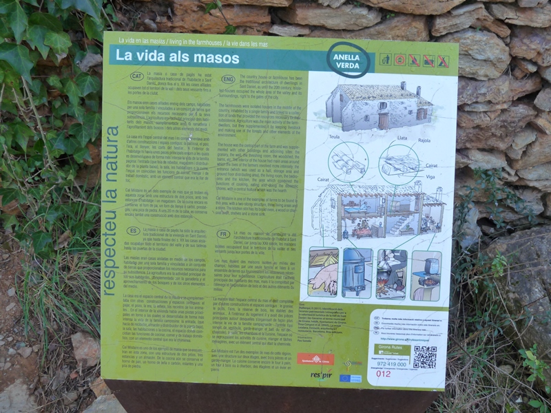Masia en ruïnes amb un plafó explicatiu que ens parla del paper de les masies a la Vall de Sant Miquel. A la dreta surt un camí que puja també al Castell de Sant Miquel per la ruta Est (pel coll d’en Figueres).
