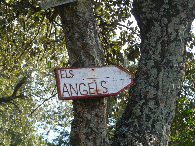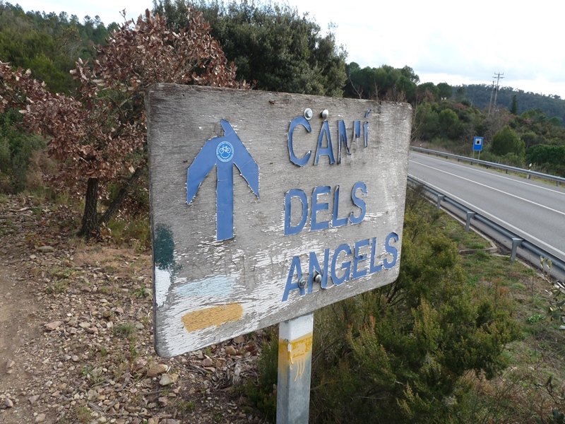 Anem a l’esquerra en direcció sud-est cap al Santuari dels Àngels, a 1h13min segons el senyal. Al cap de 5-6 minuts el corriol desemboca a la carretera GIV-6703 que va a Madremanya. Un minut més tard arribem a la casa de les Figues.