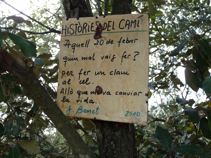 Cruïlla de camins amb un rètol amb el nom de l’indret i un pal indicador. També hi ha un banc de pedra entre alzines que convida a la pausa i al descans. En aquest punt abandonem el PR C-192 que anàvem seguint des del Castell de Sant Miquel per continuar ara pel PR C-196, sender que ja no abandonarem durant la resta d’excursió, i que utilitzarem per arribar fins al Santuari dels Àngels i després per seguir-lo de tornada a Girona.
