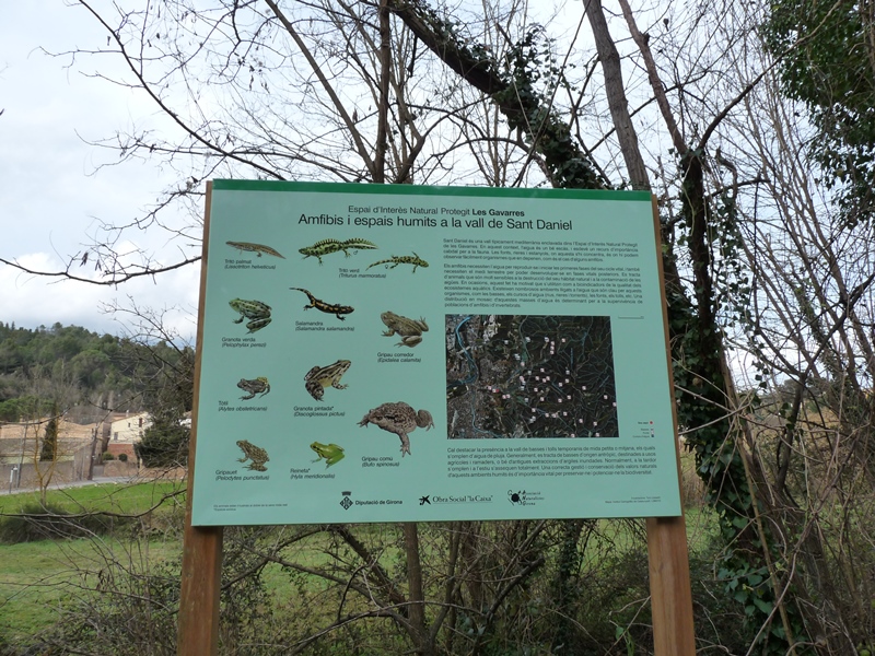 A la dreta del camí trobem una gran esplanada utilitzada com a pàrquing per als visitants de la zona de lleure de la font del Ferro, situada a pocs metres a la dreta. En aquest punt trobem un pal indicador i un plafó explicatiu dels amfibis de la Vall de Sant Daniel.