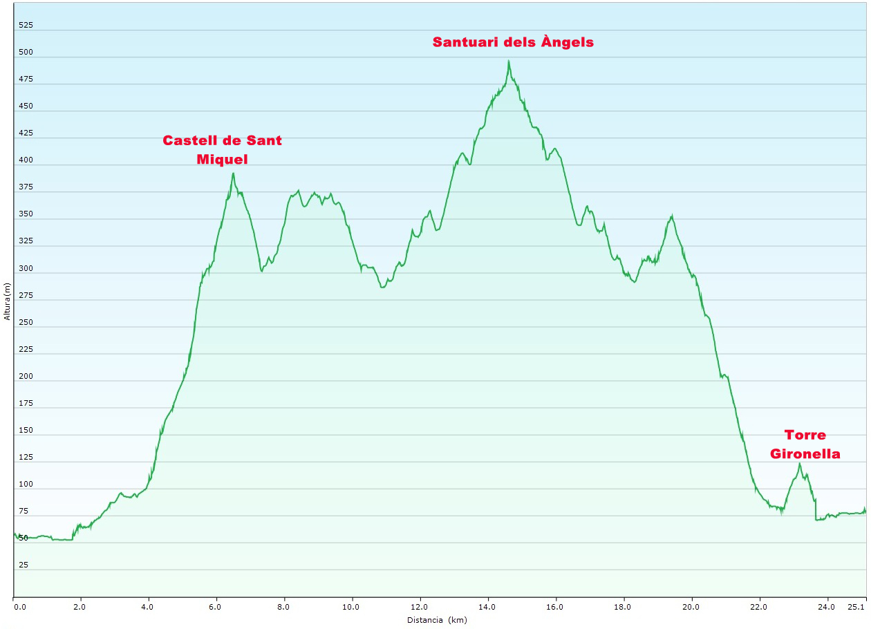 - Ruta: Estació de Girona – Sant Pere de Galligants – Sant Daniel – Fàbrica d’en Saguer – Pont de Sant Miquel – Can Lliure – Can Mistaire- Cal Micaló – Puig de Sant Miquel – Coll d’en Figueres – Coll de la Ferriola – Puig Estela – Collet d’en Pau Birol – Puig de les Àguiles – Olivet d’en Salgueda – Casa de les Figues – Santuari dels Àngels – Olivet d’en Salgueda – Carretera N-II (pas inferior) – El Galligants – Can Poater (restaurant Cul del Món) – Torre Gironella – Catedral de Girona – Estació de Girona