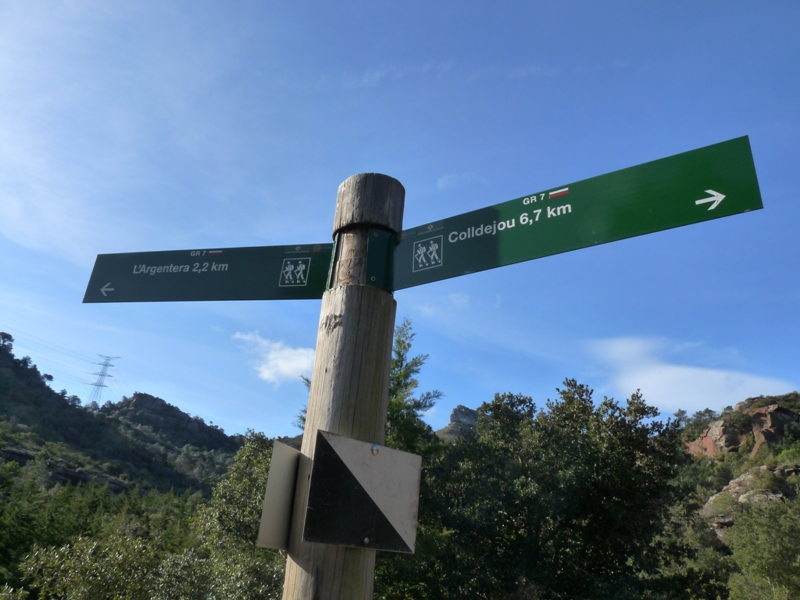 És l’opció més curta. Un cop sortim de l’estació, prenem la carretera T-343 a la dreta (oest) durant 1.500 metres fins al centre del poble de l’Argentera, on trobarem un pal indicador del sender GR-7 a la plaça d’Escornalbou.