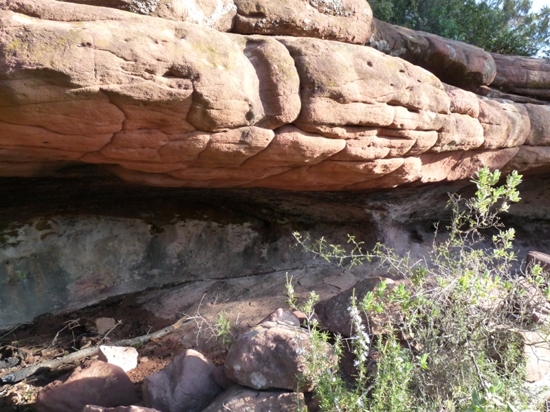 Pas entre dues roques on deixem la pista que hem seguit des de L’Argentera per prendre un corriol que s’enfila vessant amunt entre un bosc mixt de pins i alzines. Anem en direcció a Colldejou (pal indicador) a estones amb panoràmiques cap a la nostra dreta als cims rocallosos del Morral del Moster i el Morral Blanc. El camí puja zigzaguejant i passa per la Cova del Cabrer, una petita balma sota una roca de gres vermell. Si ens fixem bé, dalt de la carena podrem veure la Torre de guaita del Túnel, una construcció rodona situada entre els molins del parc eòlic.