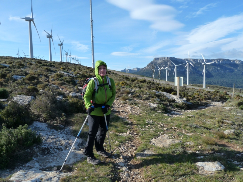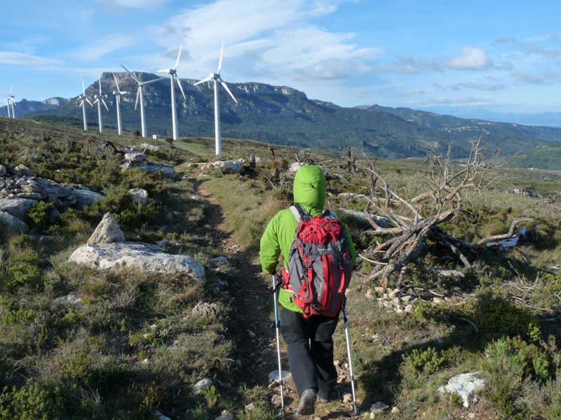 El GR-7 que seguíem gira al sud cap al coll Roig a través del Parc Eòlic de Trucafort. El parc està format per 91 aerogeneradors de dues potències diferents que produeixen en conjunt un total de 80.000 Mwh/any, l’equivalent al consum domèstic de 25.000 famílies. En veure aquest paisatge malmès pels molins de vent, sempre ens preguntem si no hi havia cap més alternativa que per un suposat benefici del medi ambient, destruir el poc que queda sense alterar el nostre paisatge, les carenes de les muntanyes.