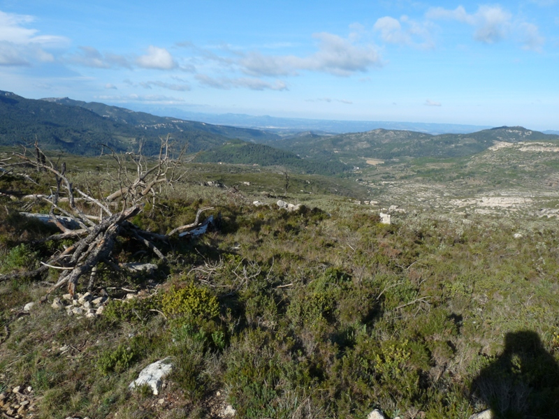 Anem vers a l’oest seguint un caminoi que travessa diversos aerogeneradors per baixar per un vessant de la serra que deixa a la dreta el barranc de Comes Joanes i a l’esquerra el de les Castellanes. Aquesta part de la muntanya va patir un greu incendi l’any 2007 del qual encara s’està recuperant. La Mola de Colldejou apareix majestuosa davant nostre, i al fons podem veure el poble de la Torre de Fontaubella, el més proper a l’estació de tren, que també podem veure des d’aquí a l’altre costat del petit turó del Collet Rodó.