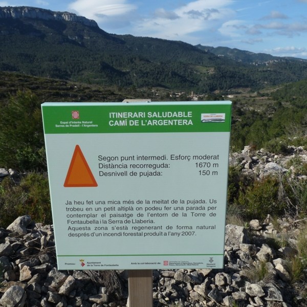 La cruïlla, tot i que evident, només està marcada amb una gran fita de pedres. Si volem acostar-nos fins a la Torre de Fontaubella, cal seguir el sender abalisat que anem seguint durant 15min (850m) més.