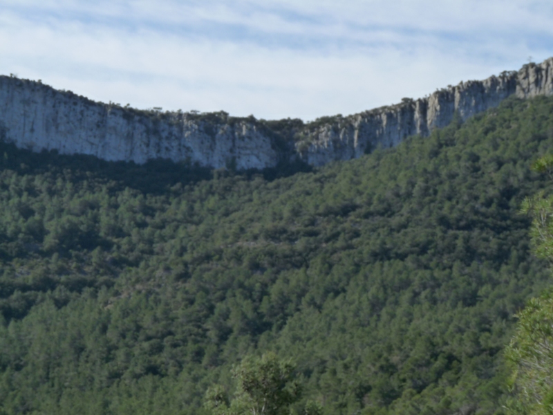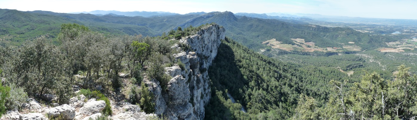 Reprenem el camí que ressegueix en tot moment arran de la cinglera sobre una balconada excepcional. Anem enlairats per un camí aeri i poc fressat amb vistes cap a les parets del mateix cingle de Calàs i cap a les muntanyes del Priorat i la Ribera d’Ebre, com el Montsant, la Picossa o els Ports.