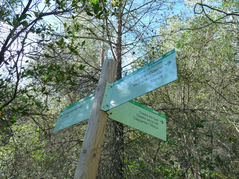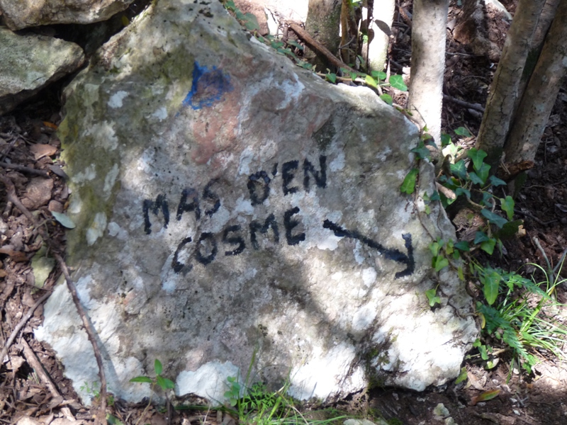 El sender desemboca a una cruïlla (pal indicador). Per anar al Mas del Cosme cal seguir a l’esquerra 110m.