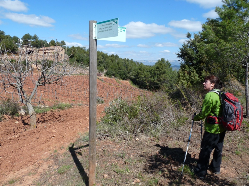 Creuem les vinyes envoltant-les per l’esquerra anant en compte de seguir la direcció al Mas d’en Cosme que llegirem als pals indicadors.
