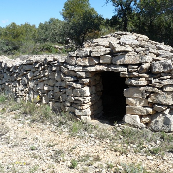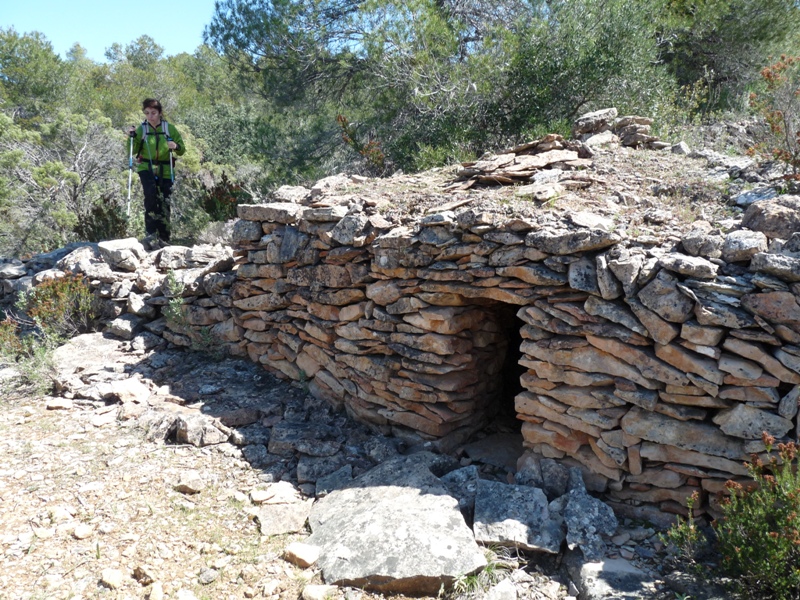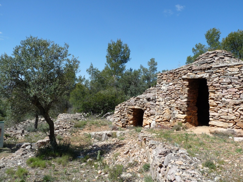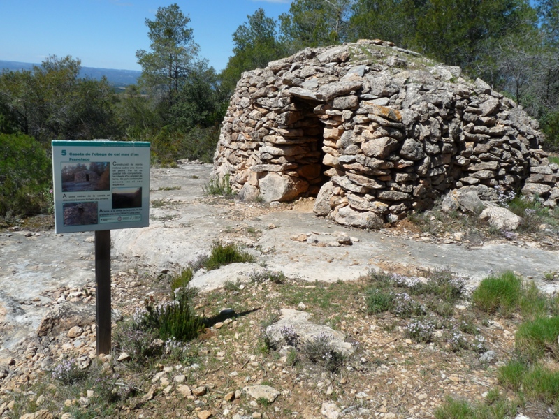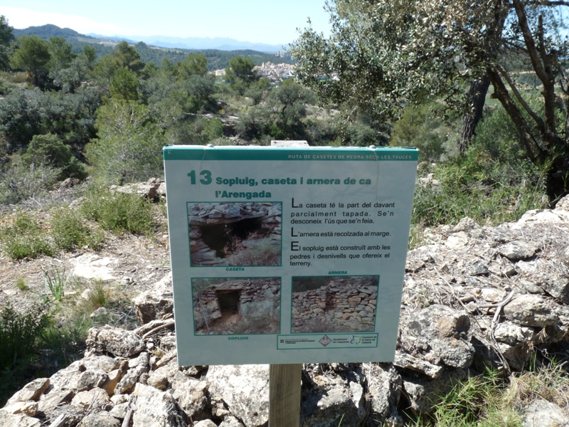 Abandonem la pista del Camí de les Taules per prendre a l’esquerra un corriol que ens portarà a visitar tot un reguitzell de construccions de pedra en sec que inclou barraques, arneres, cocons, marges i sopluigs entre els elements més destacables. La ruta està senyalitzada amb fletxes i pintura groga, i recorre prop d’una vintena de construccions fetes amb aquesta tècnica. Al costat de cada caseta (barraca) o element trobarem un plafó informatiu amb el seu nom, un número, i una petita explicació de cadascuna d’elles.