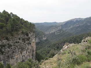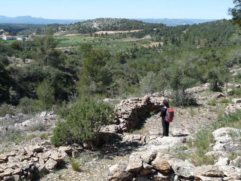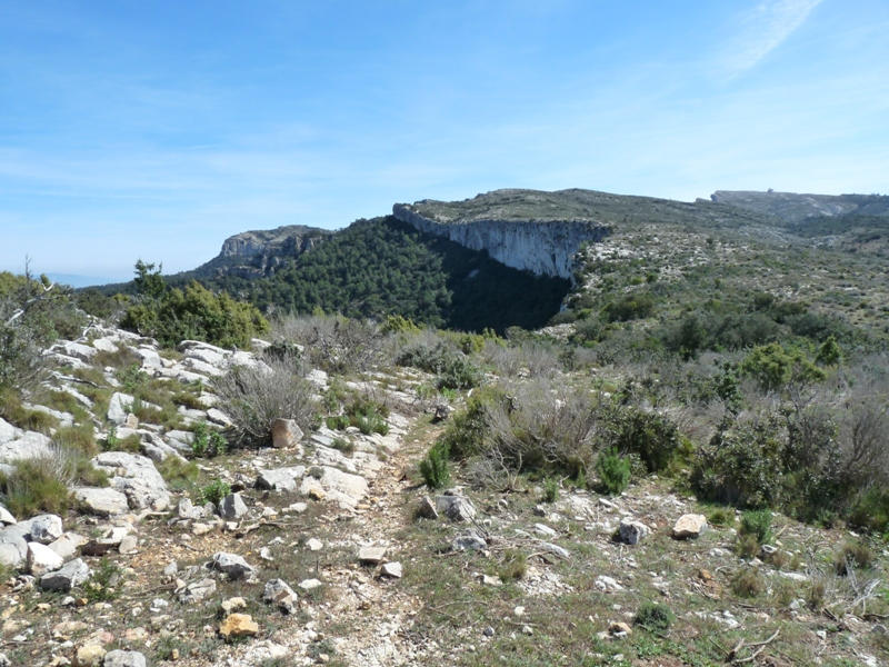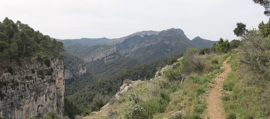 Baixem en direcció oest amb vistes al barranc del Tortó a la dreta i dels cims de Montalt amb la Serra de Mestral al fons. El camí recorre uns metres el fons del barranc d’en Jover abans d’arribar a la cruïlla amb el GR-7.