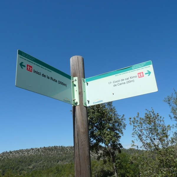 Taula 17 (pal indicador). Després de 620m (8min) d’agafar el camí, trobem a l’esquerra un indicador que ens porta en 20m a la Taula 17 Cocó de Cal Ximo de Cama entre oliveres. Aproximadament 200m més endavant, surt el corriol d’ inici del Camí de les Taules.
