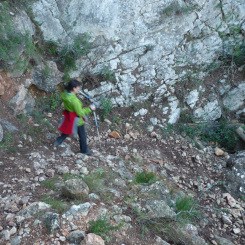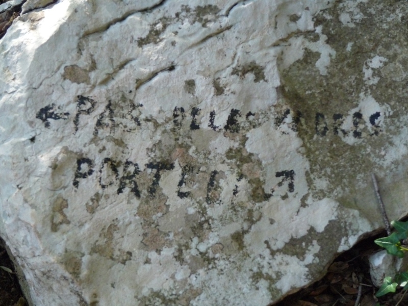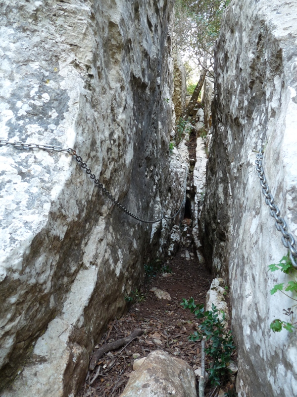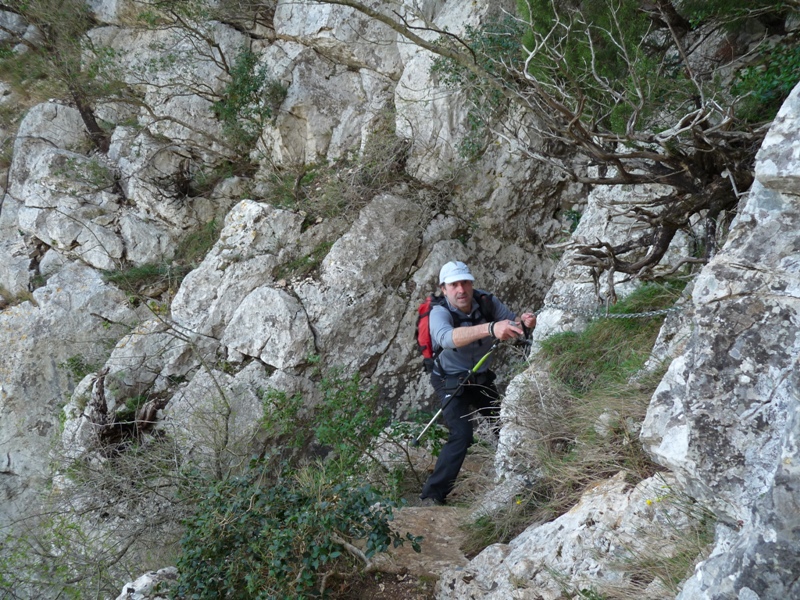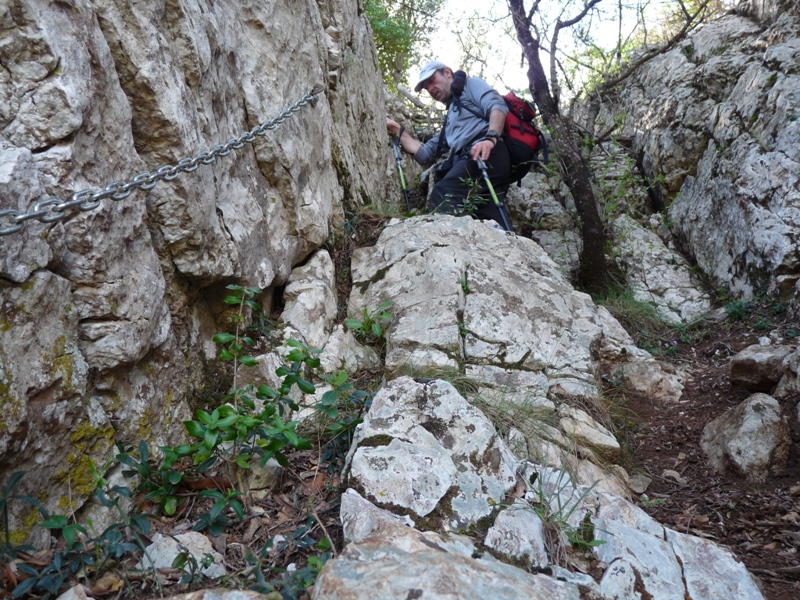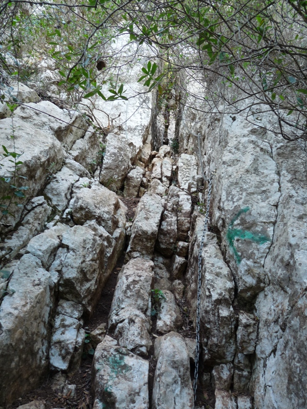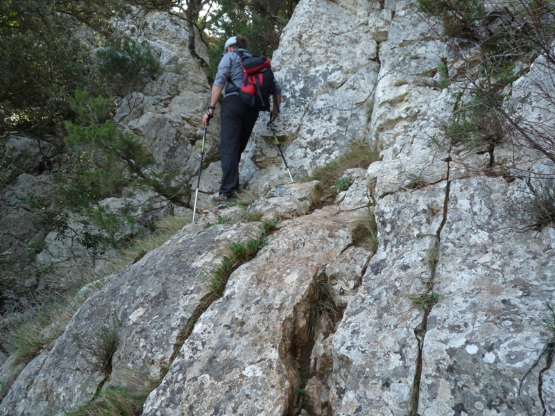 De nou a la cruïlla per on hem baixat de la Cresta del Gall, anem ara en direcció al Grau (pas equipat) i Llaberia i segons ens informa el pal indicador. El corriol està mig engolit per la vegetació i és una mica perdedor i incòmode, amb trams pedregosos i variants que ens faran dubtar de quin camí seguir. Hem d’estar atents de seguir unes marques de pintura blava que trobarem de tant en tant pintada als arbres i les pedres.