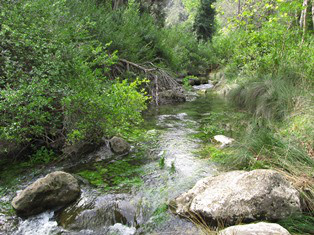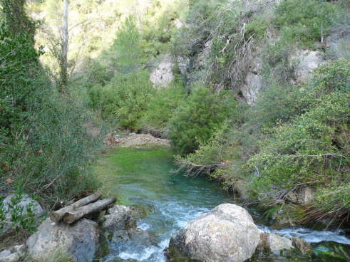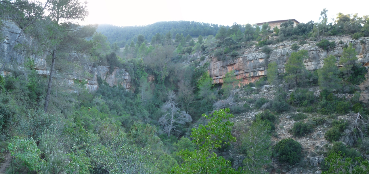 Bonic racó ple d’encant on l’aigua que baixa del torrent del Collet ha creat formes capricioses als cingles calcaris que envolten l’indret. El sender segueix enlairat sobre el barranc de la Vall, arribant a uns camps d’oliveres poc abans de desembocar de nou al Camí de la Vall.