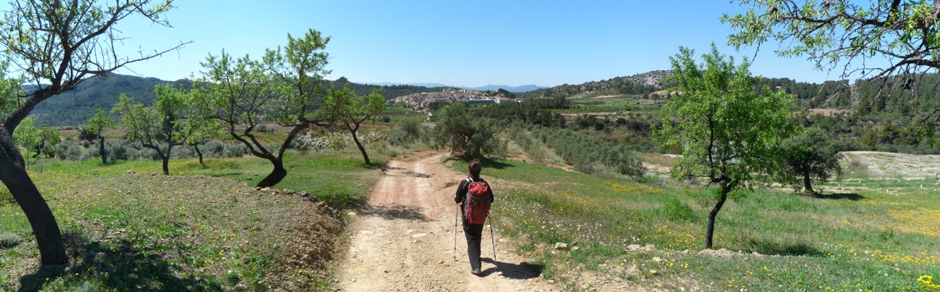 Deixem el sender PR C-92 que es dirigeix cap a Falset i tombem a la dreta Camí de les Taules amunt, entre camps d’ametllers i amb bones vistes sobre Capçanes a la nostra esquena.