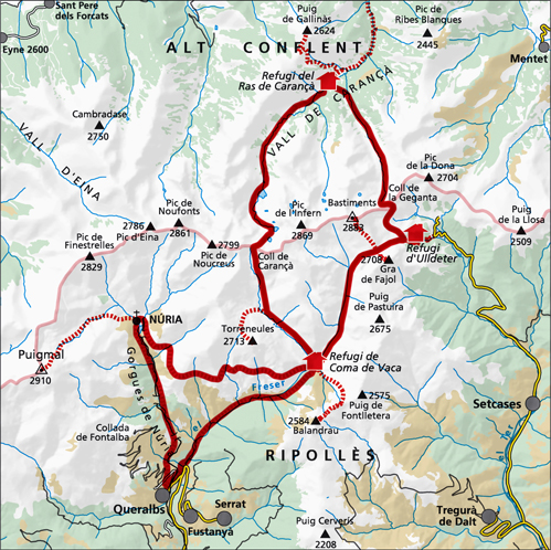 Travessa circular que recorre el Pirineu oriental i que uneix els refugis d’Ulldeter, Merialles, Ras de Carançà. L’opció més llarga afegeix la possibilitat de pujar al Canigó, el Bastiments i el Puigmal.
