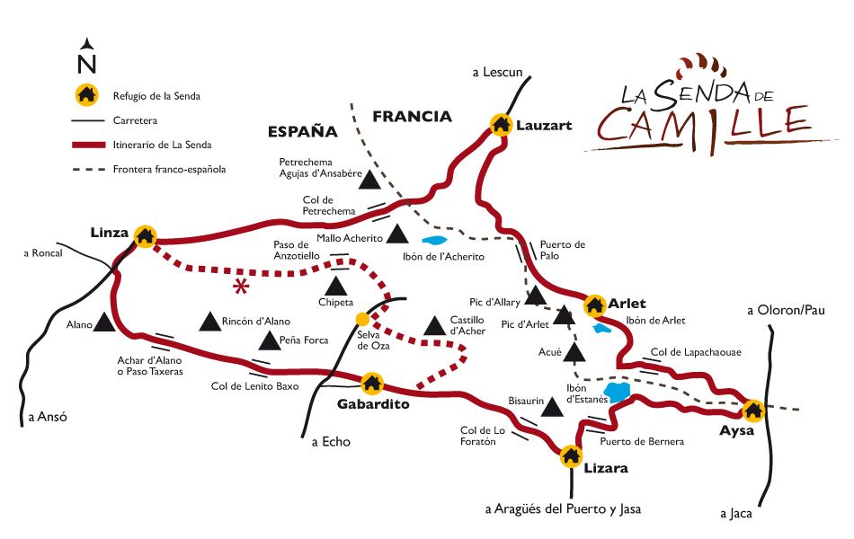 Ruta que recorre els Pirineus d’Osca i França passant per la Selva de Oza. Podem agafar un tren a Saragossa (Regionals i AVE) on podem enllaçar amb El Canfranero, línia ferroviària que havia de creuar els Pirineus que pel vessant francès mai va arribar a connectar. El tren que ens deixarà a la magnífica estació de Canfranc. El refugi d’Aysa, on podem inciar la travessa, es troba a 6km seguint el Camí de Sant Jaume
