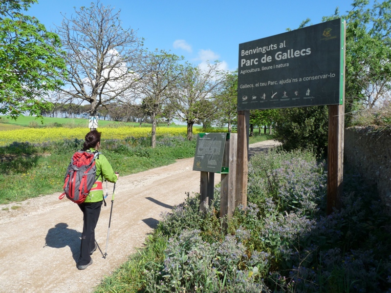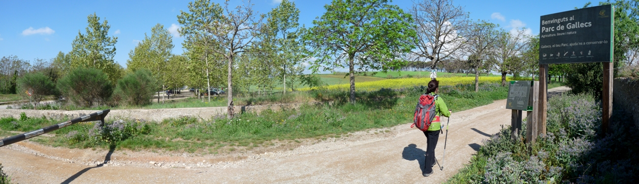Agafem al N el camí (plafons de benvinguda a Gallecs) en lleugera pujada entre arbres a costat i costat del camí entre els característics camps de conreu de Gallecs.