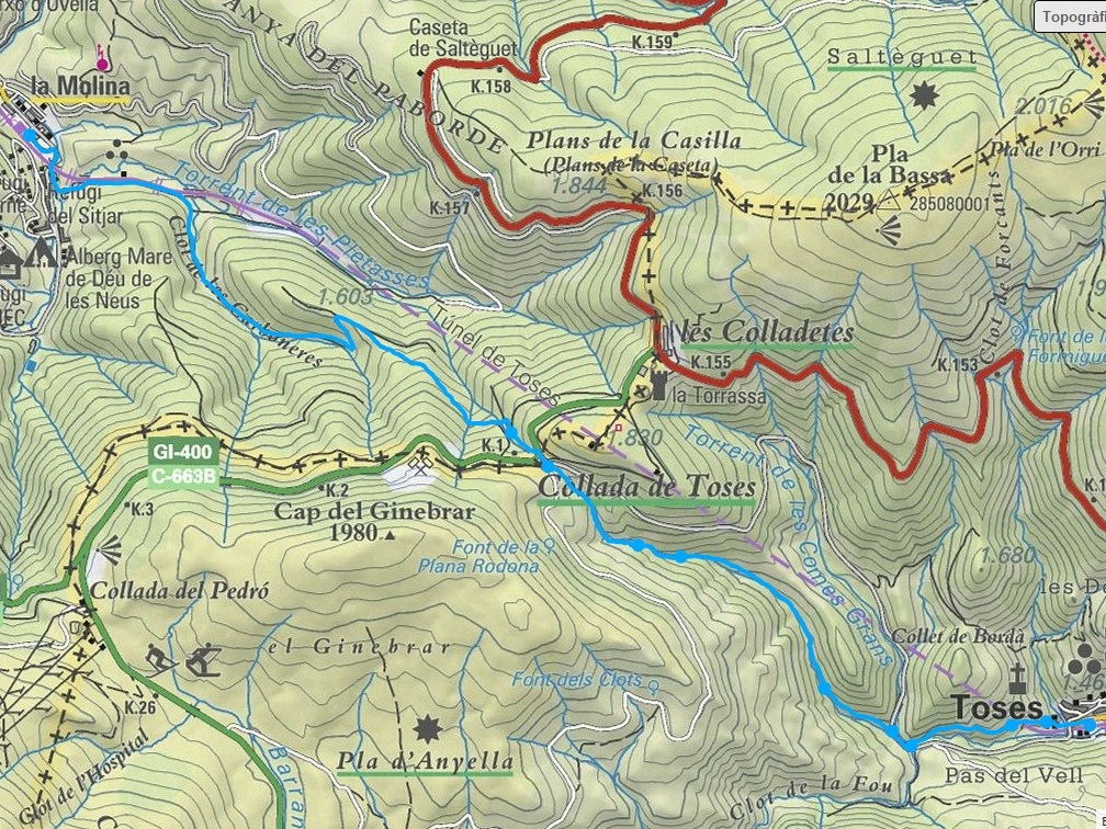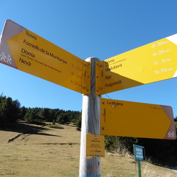 - Ruta: Estació de Toses – carretera Toses a la Collada – riu Rigat – vall d’Alp – Collada de Toses – Clot de les Carboneres – La Molina