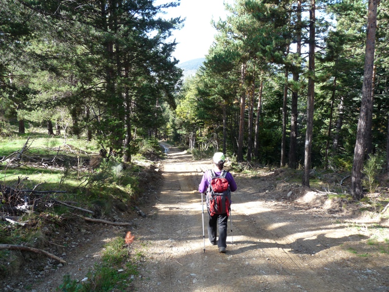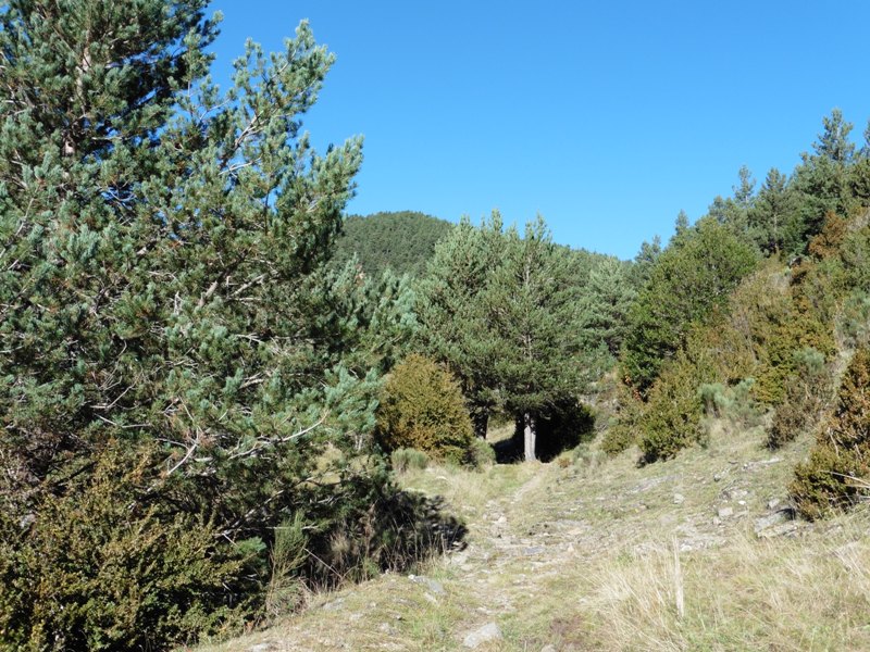 Creuem la carretera, i saltem la tanca de protecció per baixar per un camí poc marcat que baixa entre pins per la dreta d’un torrent. Al cap de 3-4 minuts, el camí desemboca just en una corba tancada d’una pista que té el seu inici a Les Colladetes.