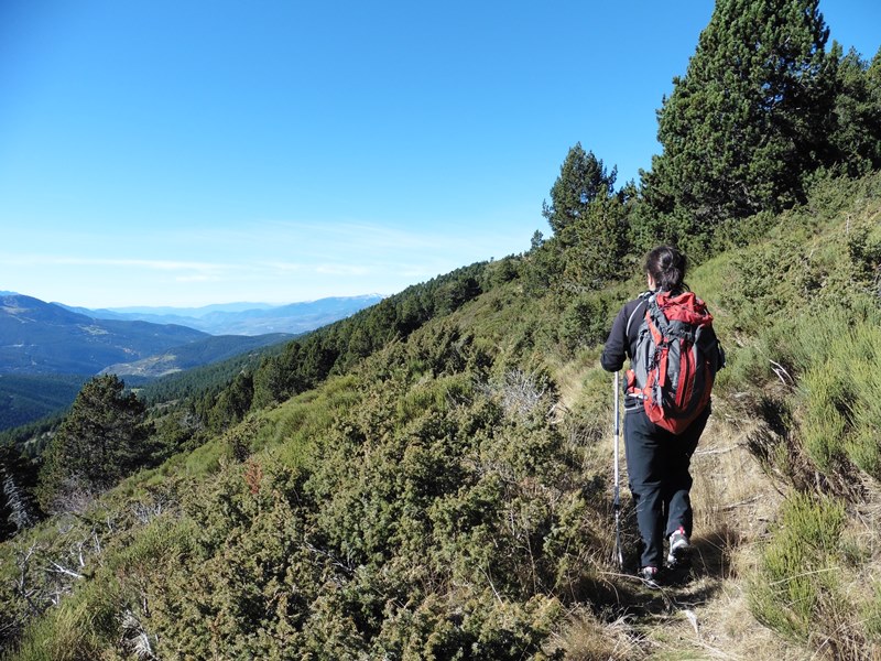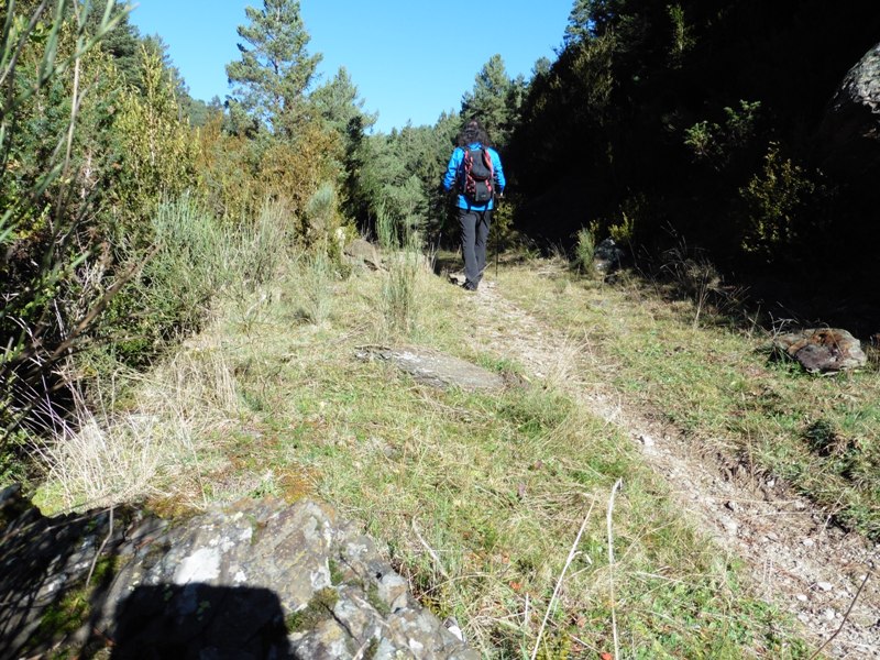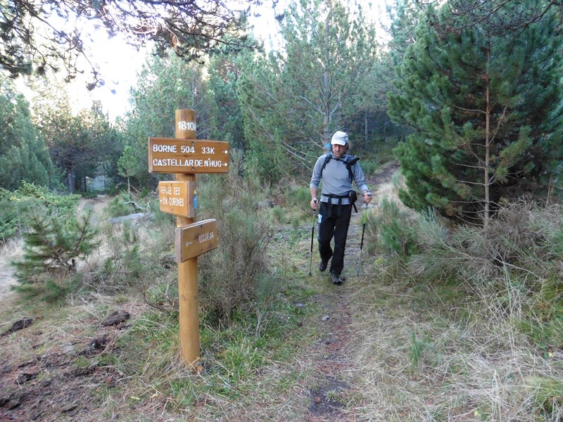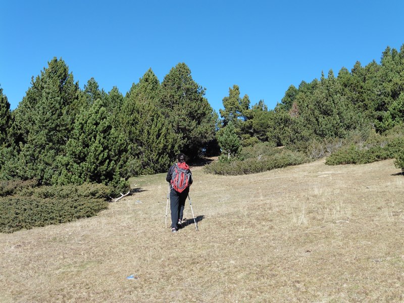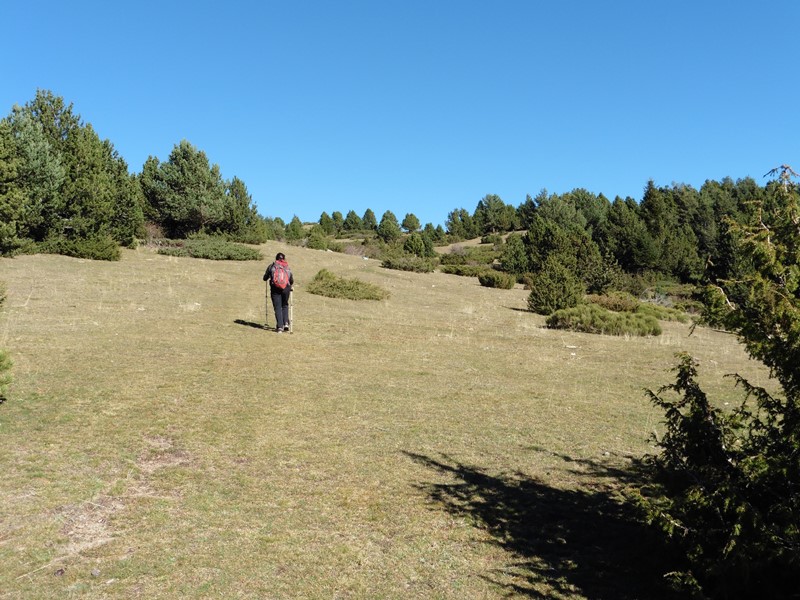 No cal arribar al mateix coll per continuar la ruta. Podem girar vers al nord seguint les marques de pintura per prendre un corriol que s’endinsa en un bonic bosc de pi negre.