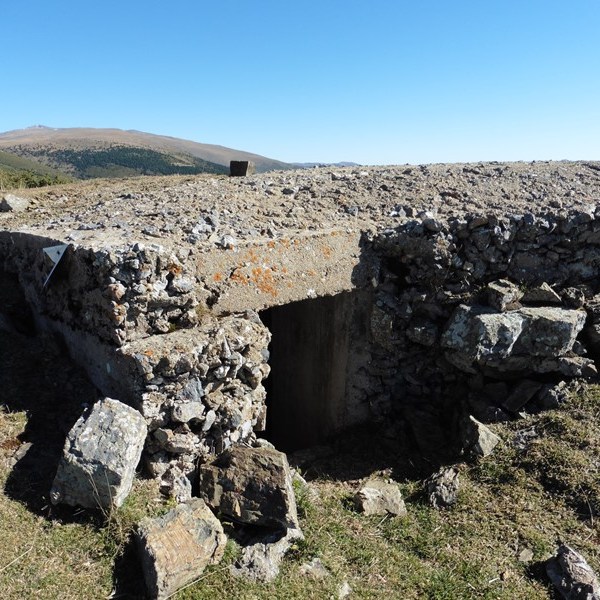 Seguim les marques blaves que ens porten per una pista paral·lela a la carretera GI-400 a ponent del cim del Pla de Canalots. Passem a tocar d’un búnquer (dreta) i continuem per darrera l’edifici de la Torrassa fins arribar al segon coll de la jornada, Les Colladetes.