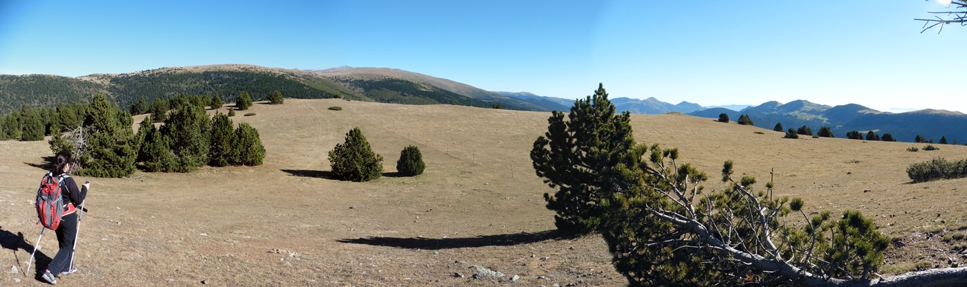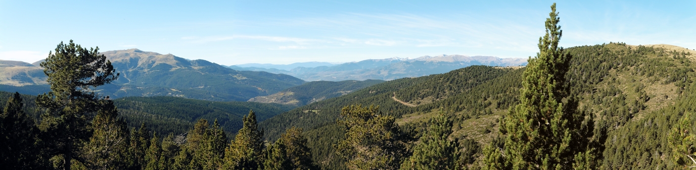 Des del coll tindrem bones vistes dels Puigmal. El camí segueix la carena de la Serra dels Lladres entre un bosc de pi negre amb neret. Al cap de 20 min (1,1km) deixem enrere una cruïlla que en 1,5 km ens portaria de nou al refugi de les Corones. El sender va perdent alçada ràpidament entre els plans de l’Artiga de Dalt i del Cardell, des d’on podem gaudir de nou d’una fantàstica panoràmica de les muntanyes altceretanes i andorranes.