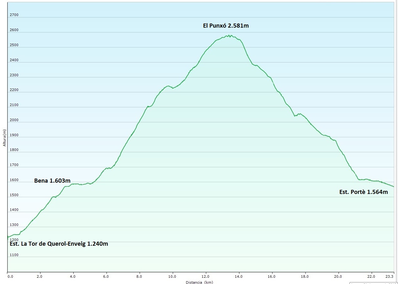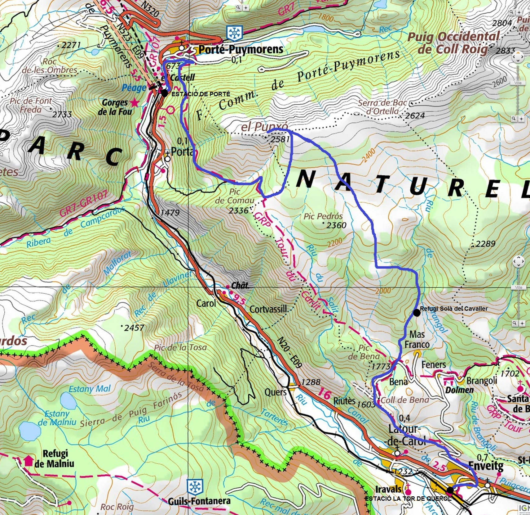 - Ruta: Estació internacional de La Tor de Querol – Enveig – Bena – refugi Solà del Cavaller – Orri d’en Corbill – Molleret de la Pradilla – Punxó – Coll de l’Home Mort – Coma Pregona – Coma Cervera – Portè – estació de Portè
