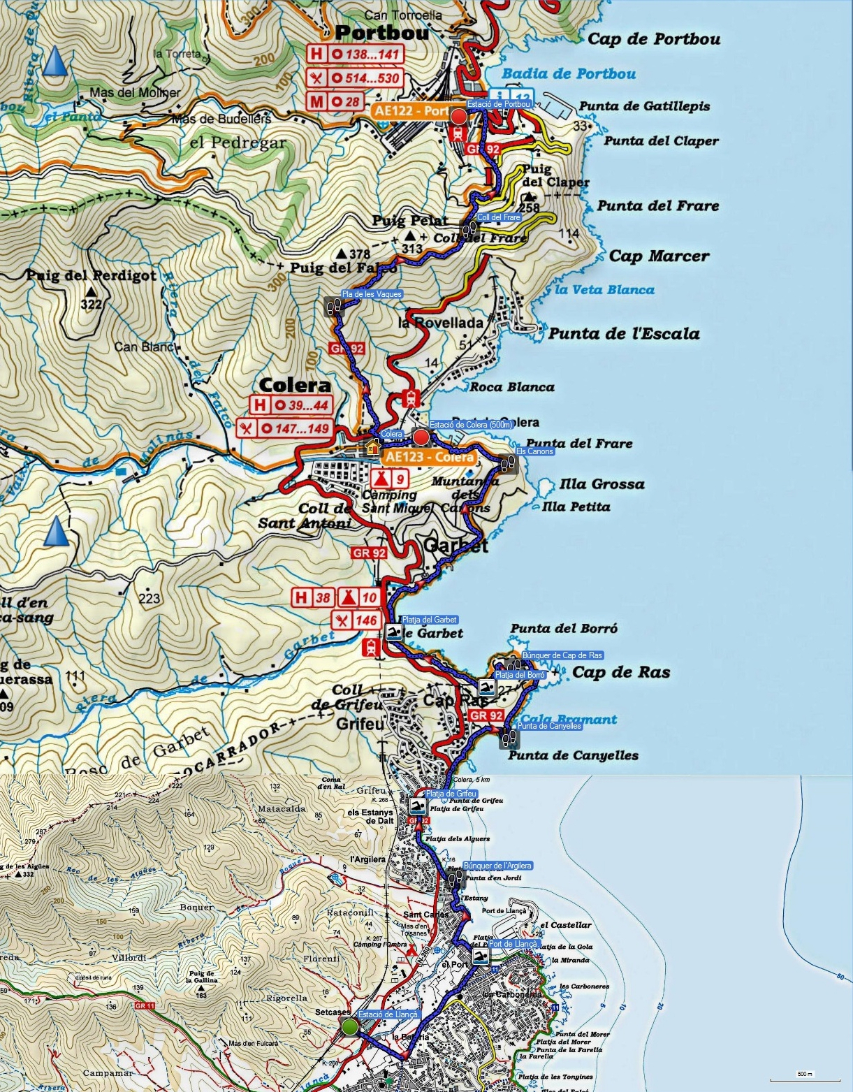 - Ruta: Estació de Llançà – Platja del Port – Platja de l’Argilera – Platja dels Alguers – Platja de Grifeu – Platja del Cros – Platja de Canyelles – búnquer de Canyelles – Punta de Canyelles – Cala Bramant – Cap Ras – búnquer de Cap Ras – Platja del Borró – Platja de Garbet – Port de Joan – els Canons – Port de Colera – Colera – Pla de les Vaques – Coll del Frare – Estació de Portbou