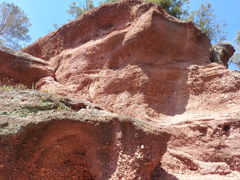 La resposta la trobem sota els nostres peus, en la geologia del territori. Aquests indrets es troben sobre afloraments del Buntsandstein, un conjunt de materials sedimentaris que formen part del Triàsic inferior, i que es caracteritzen precisament pel seu intens color vermell. Aquesta tonalitat és deguda a la presència d’òxids de ferro dins les roques, tot i que en alguns llocs, com a Sant Pere Sacama, les condicions locals poden donar lloc a roques de color més clar, fins i tot blanquinós.