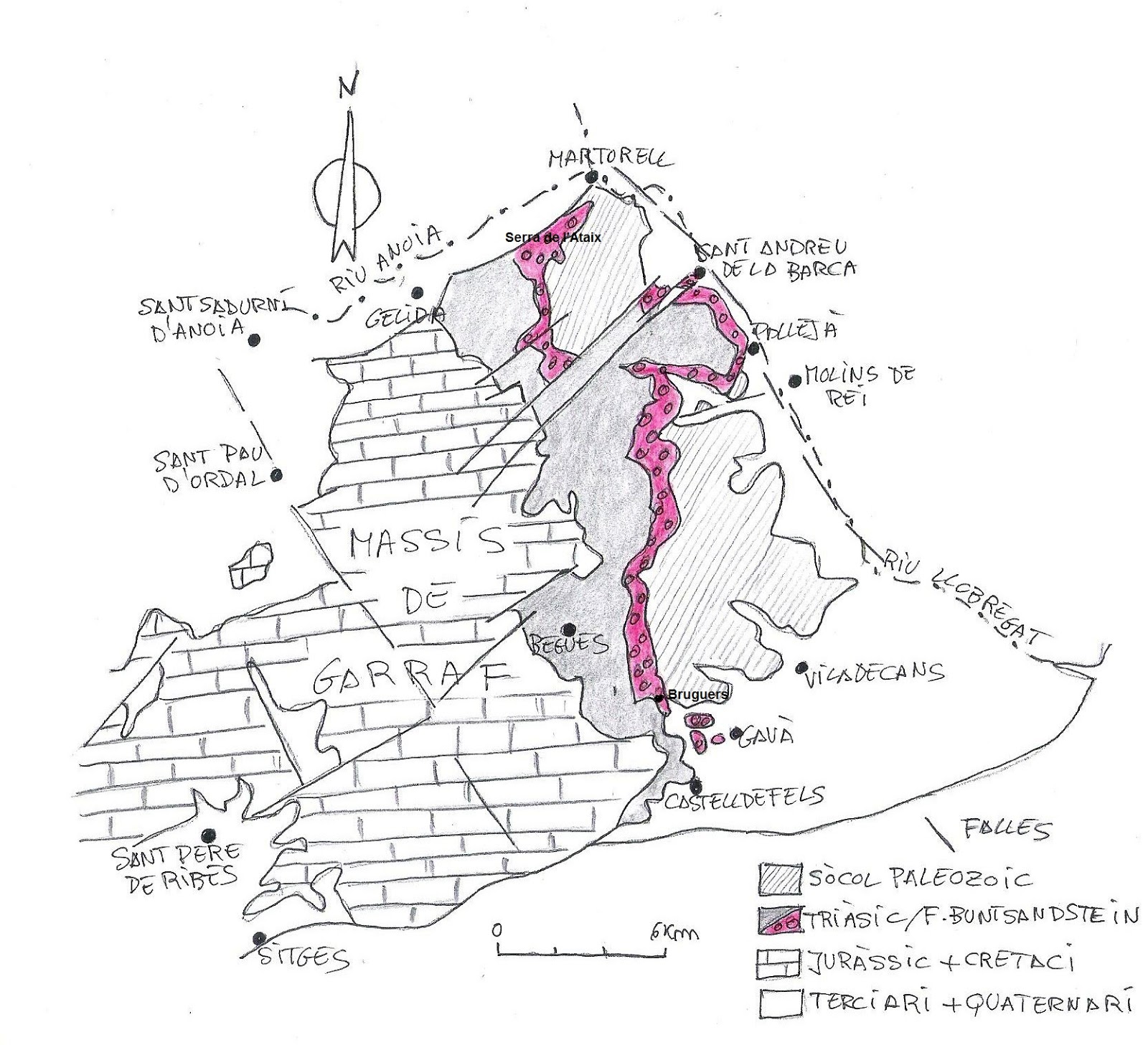 Les Muntanyes de l’Ordal formen una unitat amb el Garraf, i aquest sector més nord-oriental està inclòs en la línia d’afloraments coneguts com el Garraf Vermell que ve de Bruguers.