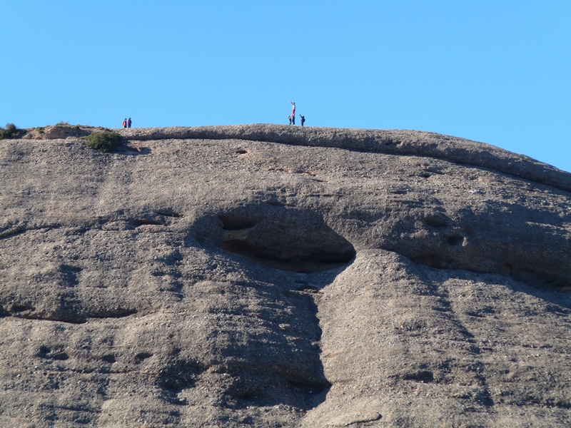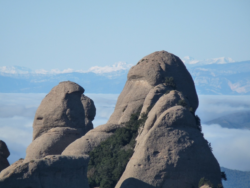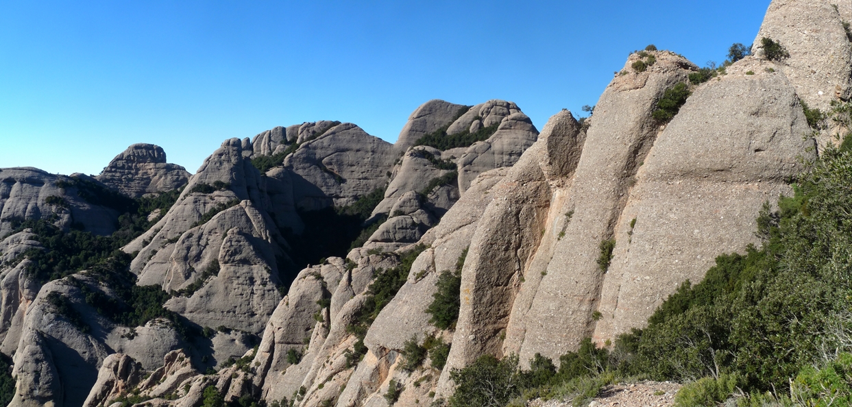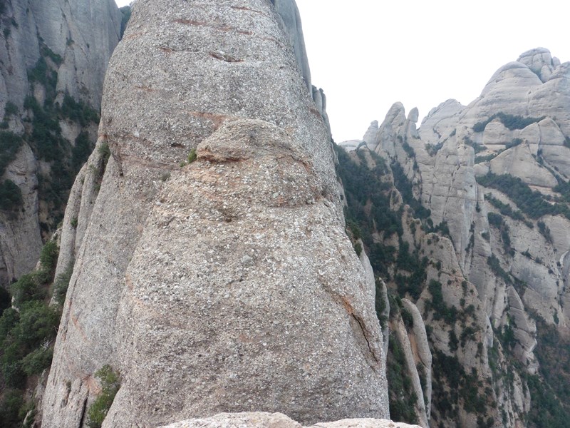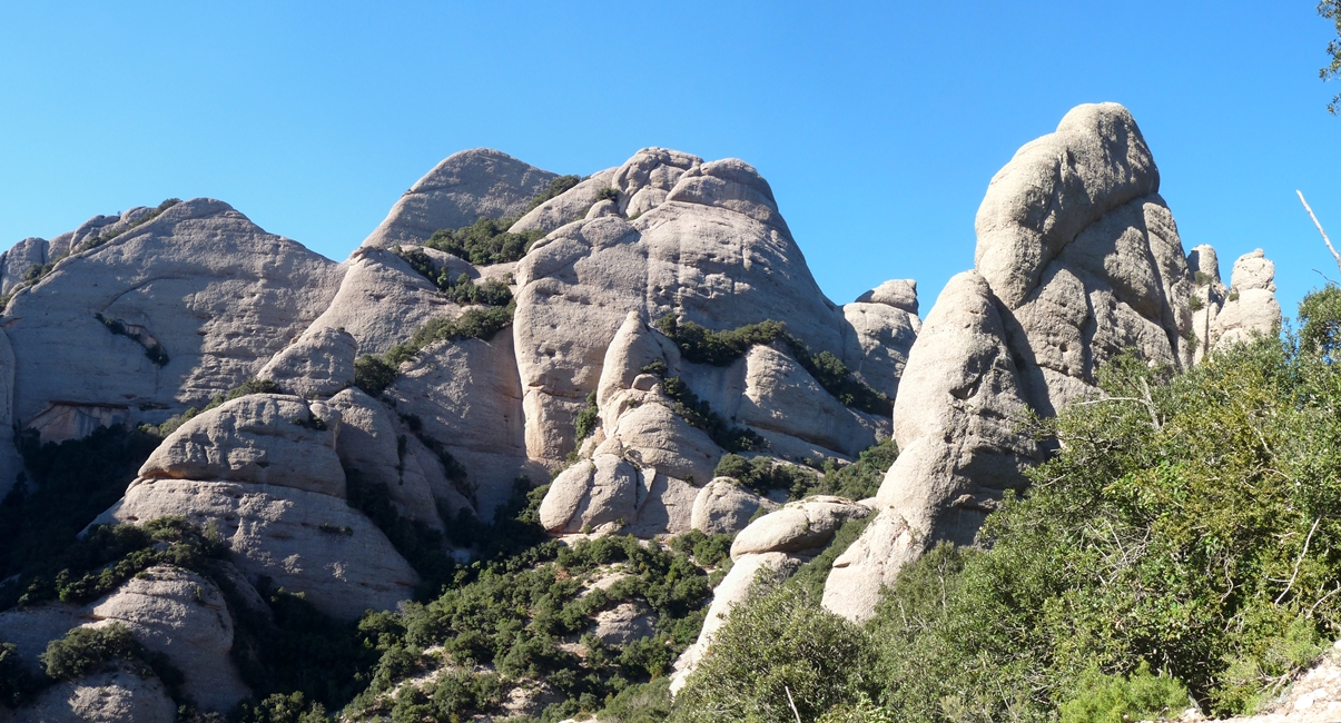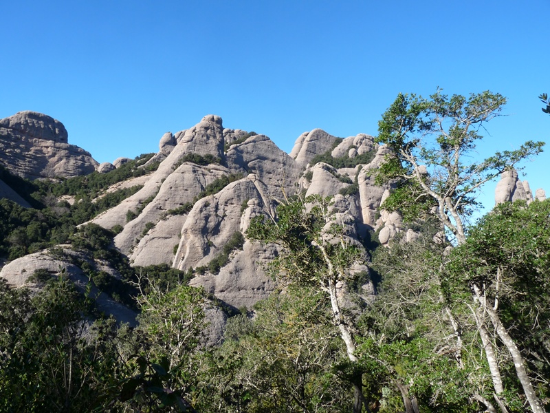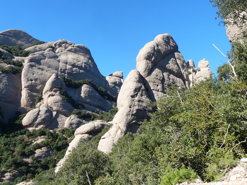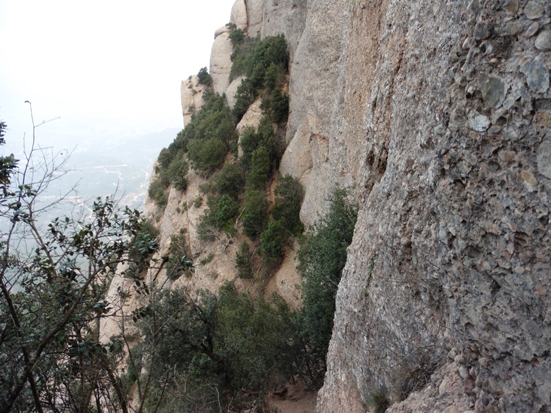 El sender transcorre pel vessant nord del massís sota les imponents parets de Sant Jeroni i dels Diables. Mentre caminem podem alçar el cap i mirar de buscar els escaladors que pugen el Cavall Bernat per la via Punsola-Reniu (230m 6c) o per la Gran Il·lusió, 235m 7a+ (6a+ oblig.), dues vies clàssiques d’escalada d’aquesta imponent agulla montserratina.