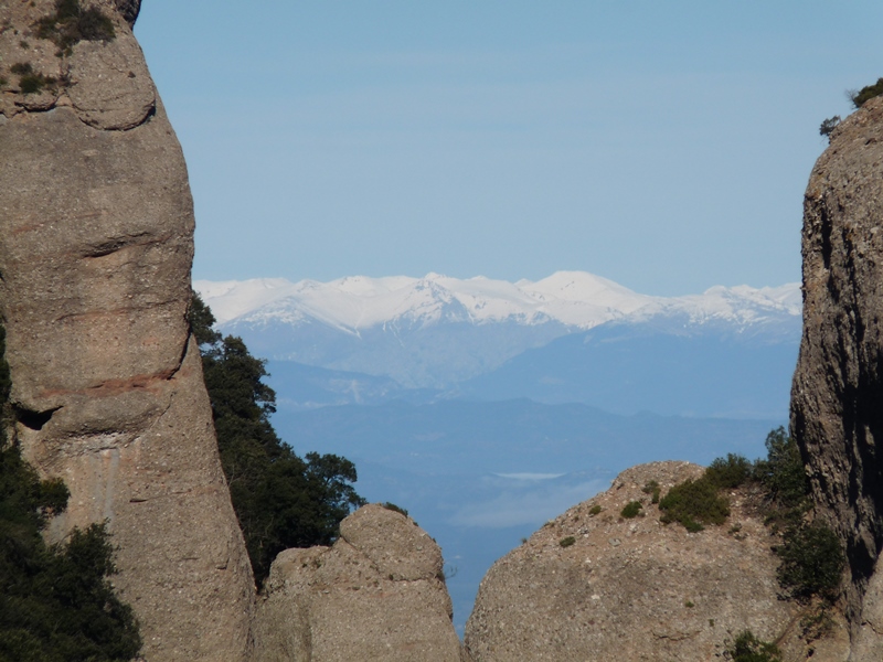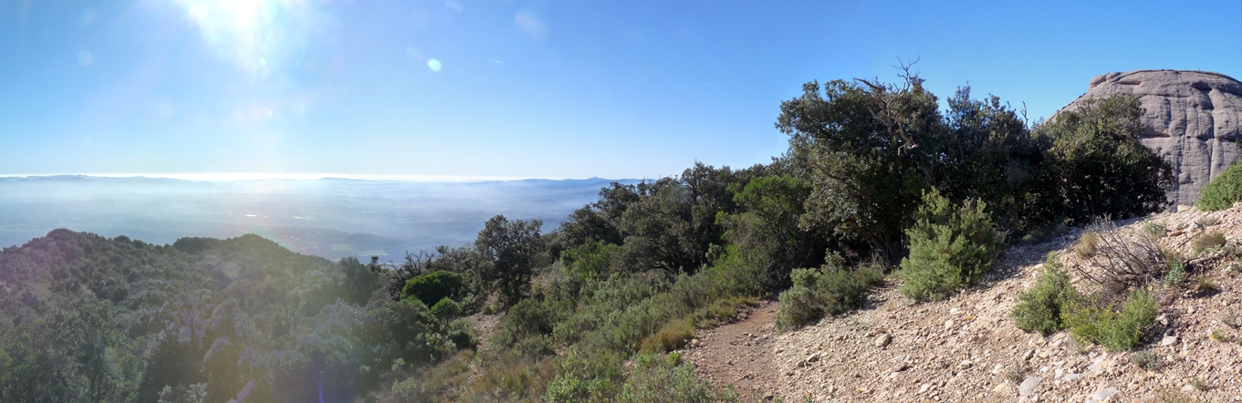 Prenem a mà dreta el sender que segueix el PR C-19, el GR-4 i el GR-172 en direcció nord. Als pocs metres passem per la Miranda dels Ermitans, un excel·lent mirador del Monestir des d’on podem albirar clarament Vacarisses, Sant Llorenç, la serra de Collcardús i Cul de Portadora i el Puig Ventós just a l’altre costat del Llobregat.