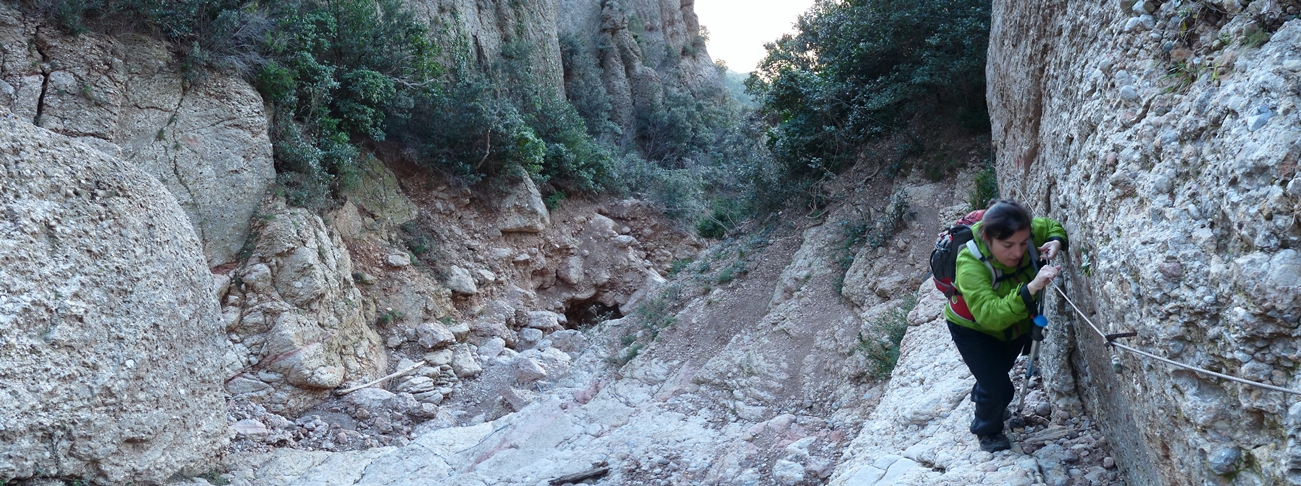 Alternativament, des de la cruïlla d’inici de la VF, podem continuar pujant per la canal de Sant Jeroni fins a l’ermita de Sant Jeroni, on connectarem amb la ruta evitant la via ferrada. L’ascens suposa superar algun pas equipat sense dificultat. Un cop a l’ermita podem prendre el camí normal fins al cim de Sant Jeroni o bé emprendre la tornada directa al Monestir.