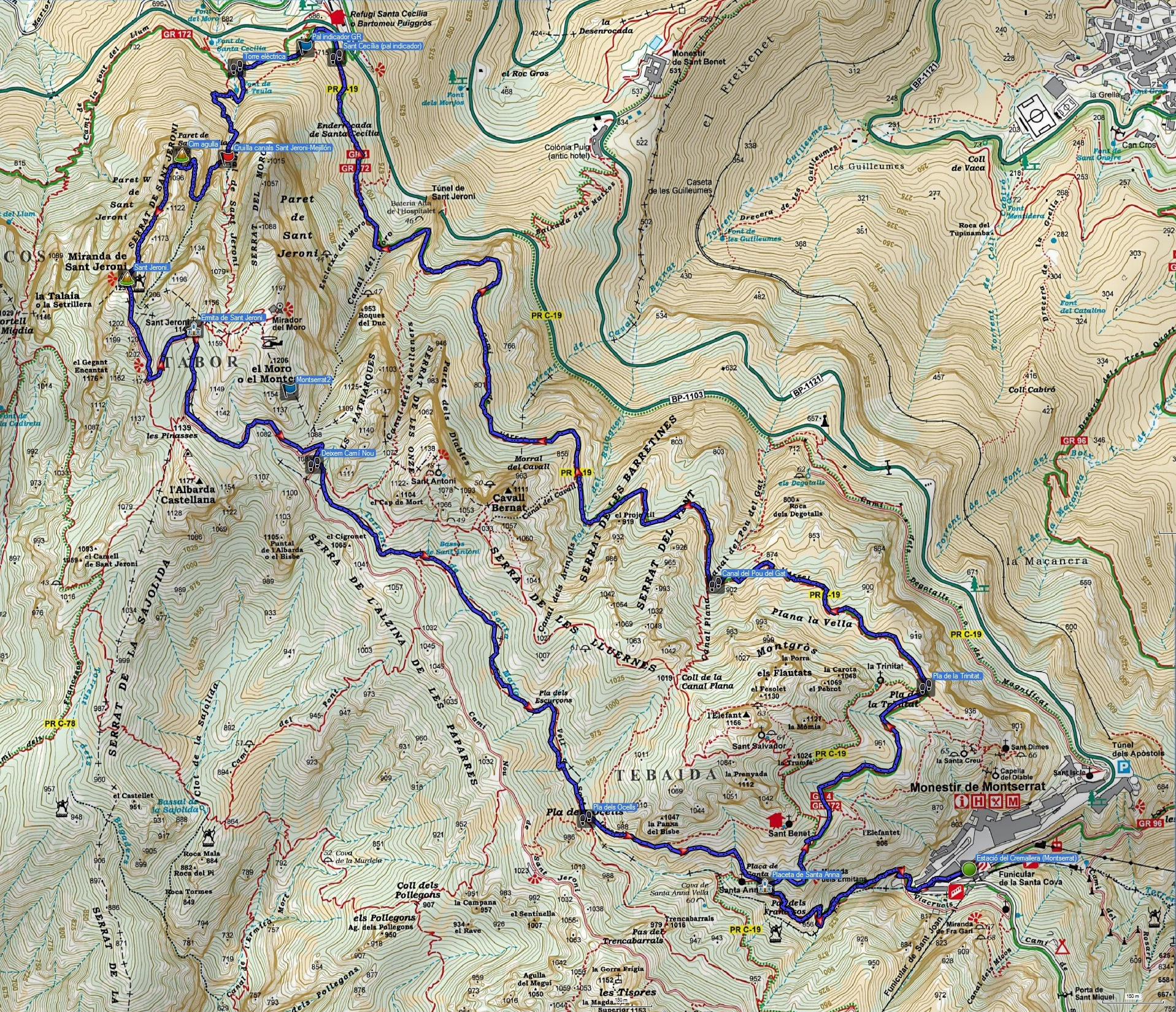 - Ruta: Estació de Montserrat – Escales dels Pobres – Pas dels Francesos – Plaça de Santa Anna – Pla de la Trinitat – Camí de l’Arrel – Canal del Pou de Gel – Santa Cecília (cruïlla) – Font de la Teula – VF Teresina – Sant Jeroni – ermita de Sant Jeroni – Pla dels Escurçons – Pla dels Ocells – Plaça de Santa Anna – Montserrat.
