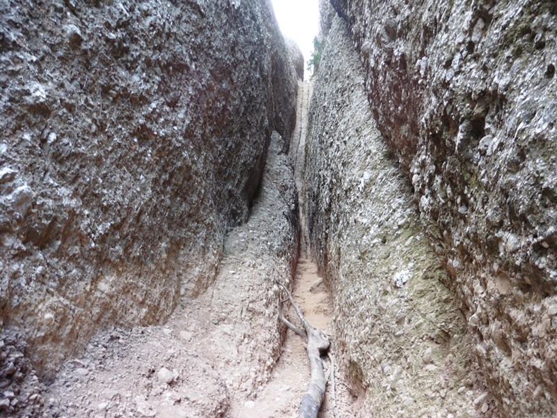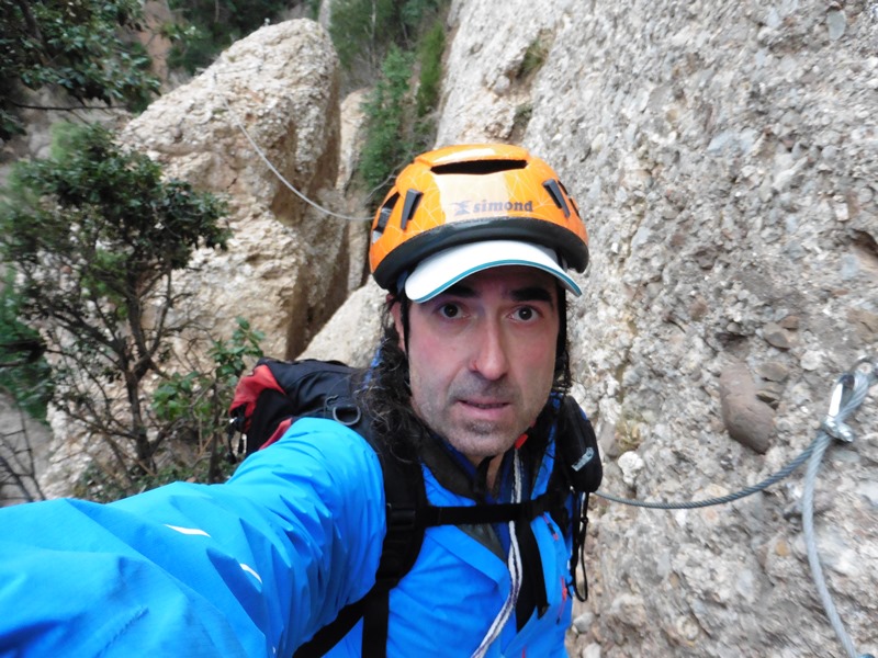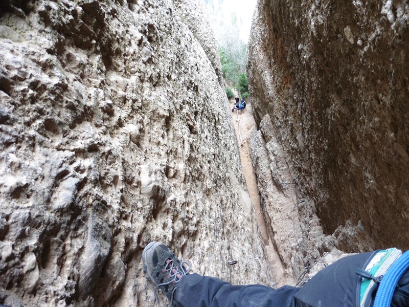 El camí va a parar al tram final i més complicat de la ferrada, una estreta xemeneia que cal pujar verticalment. Està equipada amb mini grapes i esglaons, sovint molt separats, que ens faran suar de valent. Molt útil la baga tipus Kong Slyde per descansar. Les motxilles ens faran nosa per superar-la atesa l’estretor de la canal.