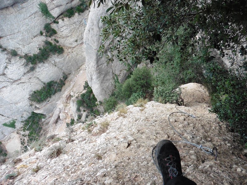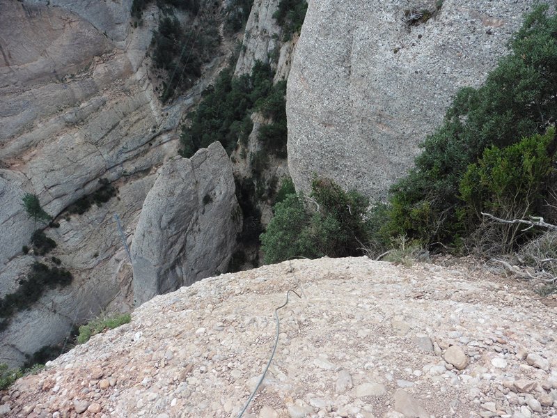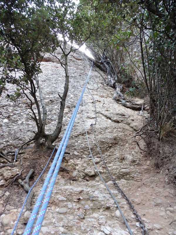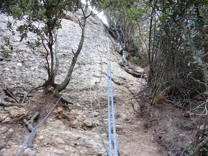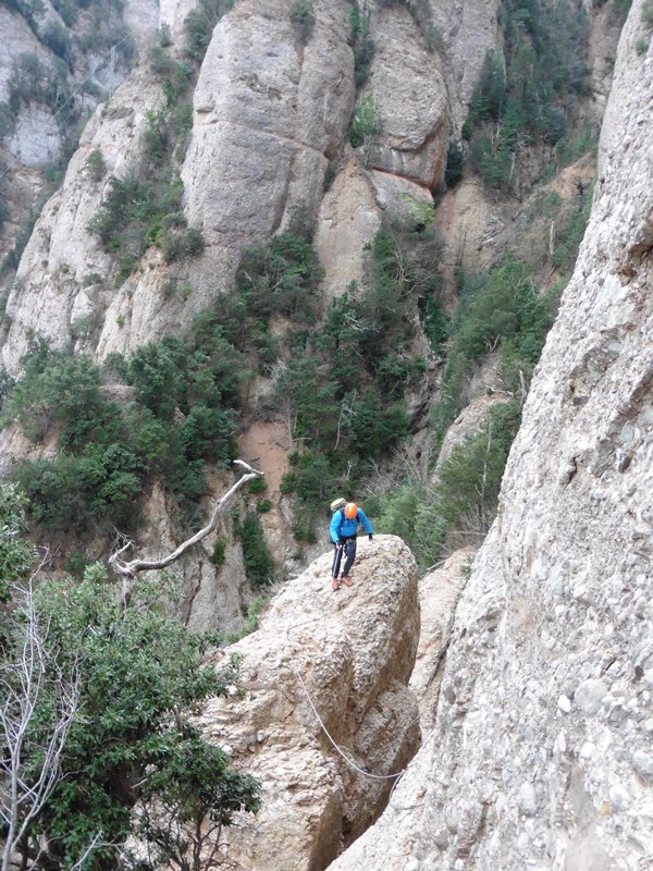 Després de l’agulla segueix un llarg tram amb passamans que es fa en bona part caminant, amb un recorregut que va per una feixa inversemblant penjada al buit. El camí emboscat va directe a Sant Jeroni. Abans, però, trobem una complexa escapatòria formada per 9 ràpels (un d’ells de 60 m) que baixen fins al GR-172, a 230 metres més avall. Trobarem aquesta sortida quan el camí, que té tendència a baixar, reinicia l’ascens.