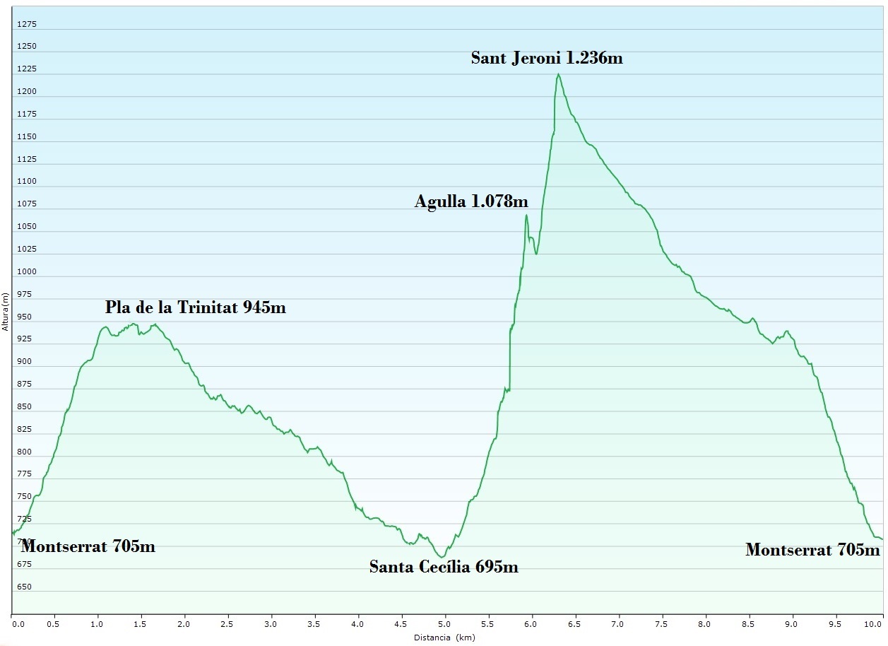 Es tracta d’un itinerari dur, que la distància total de ‘només’ 10 quilòmetres no us confongui. Bona part de la ruta va per corriols amb pujades i baixades que us deixaran les cames tocades. Per contra i com a gratificació del nostre esforç, gaudirem d’unes vistes incomparables tant durant l’ascens per la Via Ferrada com des del cim de Sant Jeroni.