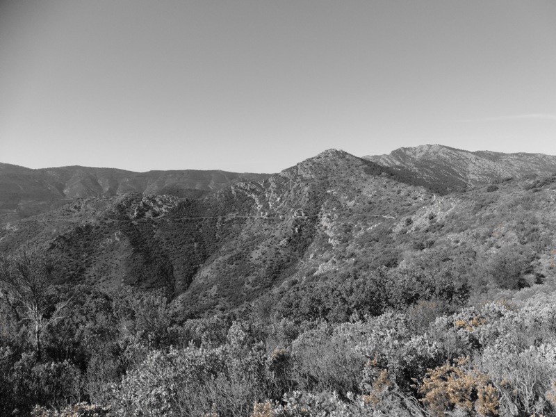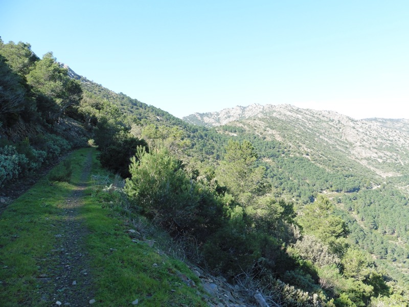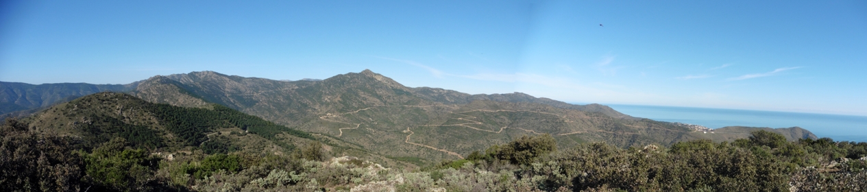 Reprenem la ruta agafant la pista a l’esquerra només uns metres, fins a trobar al cap d’un minut una pista forestal a la dreta que puja amb ganes. El camí passa cap al vessant nord de la carena, el que ens permet obtenir bones vistes a la vall de Portbou i del Querroig a l’altre costat de la vall. El camí flanqueja sota el turó de l’Ossetera, massa rocós per seguir-lo per la carena, entre una pineda fruit d’un repoblament.