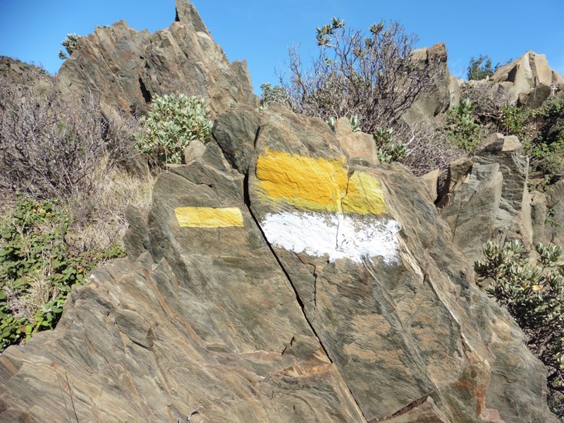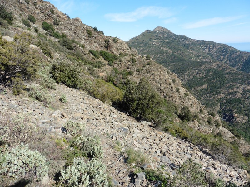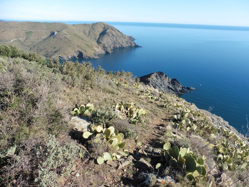 Del mateix cim surt un corriol abalisat amb pintura groga i amb pals indicadors durant tot el camí que ens facilitarà fer el camí fins a Portbou. El camí baixa amb ganes, de vegades força dret i arran dels penya-segats entre grans camps de figueres de moro. Si anem amb nens o persones amb vertigen poden sentir-se insegures en aquesta part del recorregut, tot i que no té dificultat. Cal anar amb compte de seguir sempre els nombrosos senyals grocs pintats sobre les roques.